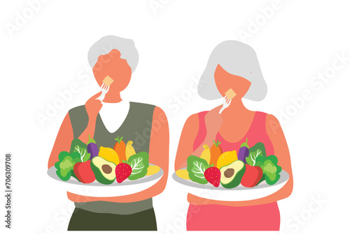 Healthy food for elderly couple concept, old man and woman eating healthy food, elderly care and  healthy aging vector illustration