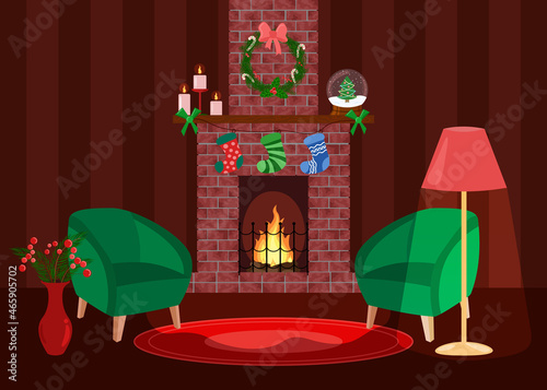 Christmas evening home interior. Lamp, candles, fire in fireplace are lit. Winter holidays fireside in dark living room. Vector flat illustration