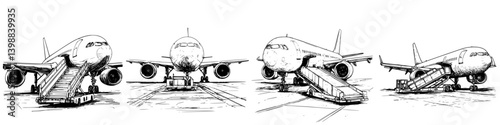 Air travel and aviation icon set. Vector cartoon collection with airplane, pilot, flight attendant, luggage, and airport equipment. Transportation and tourism flight concept.