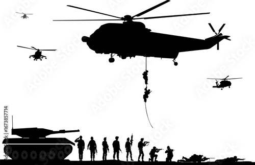 Military Soldiers and Army Forces Silhouette Set including War, Defense, Flag, and Combat Action Vector
