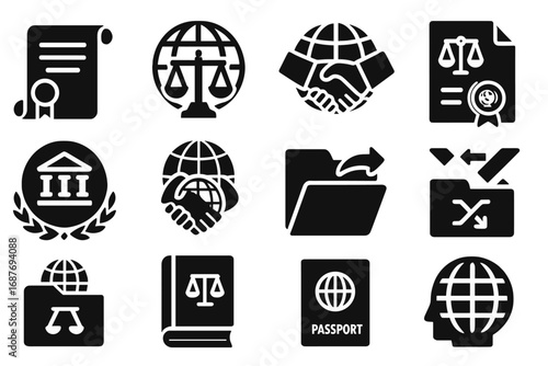 Political Authority icon set containing system, executives, senate, sanction, policy, activism, campaign, political science, civil liberties, monetary policy icon. Simple vector