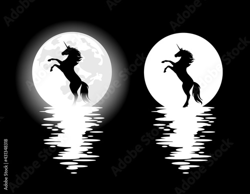rearing up unicorn horse and full moon - mysterious night nature black and white vector design set with mythical animal spirit silhouette