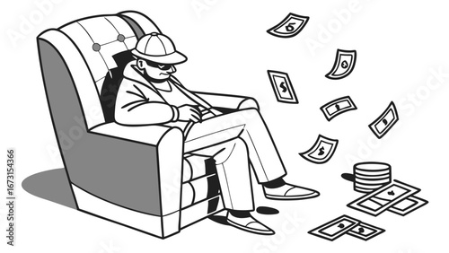 Illustration: Man in armchair with falling money and poker chips, symbolizing easy wealth, gambling, or financial success