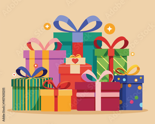 Colorful gift boxes collection, festive holiday presents, decorative ribbons, birthday celebration, Christmas packaging, flat vector illustration design, party surprise elements