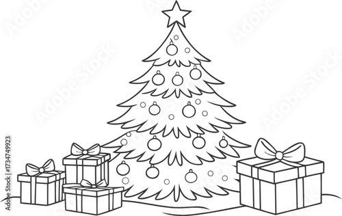 Decorated christmas tree with a golden star and colorful lights, surrounded by various festive gift boxes and sparkling ornaments on a clean background, representing holiday joy and celebration.