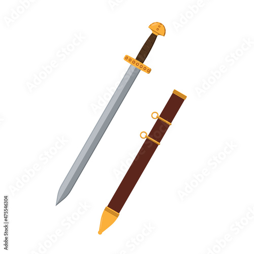 A Roman gladius with bronze guard and leather scabbard, vector on white.