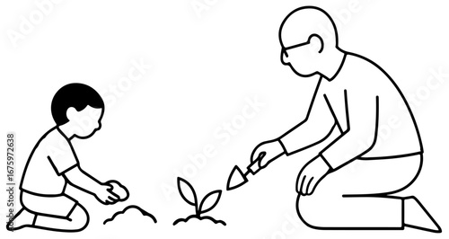 Cheerful senior man with kid. Grandparent planting houseplants with grandchild on abstract background. Senior man gardening with child. Vector illustration. Seniors. Landing page and website banner