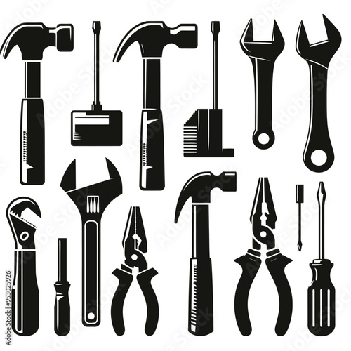 create Tool Icon set Instrument symbol, wrench, hammer, handsaw, print brush, screwdriver, adjustment wrench, victor illustration silhouette.