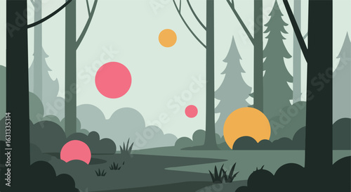 Abstract spheres amidst forest trees on hilltops for banner, wallpaper, background