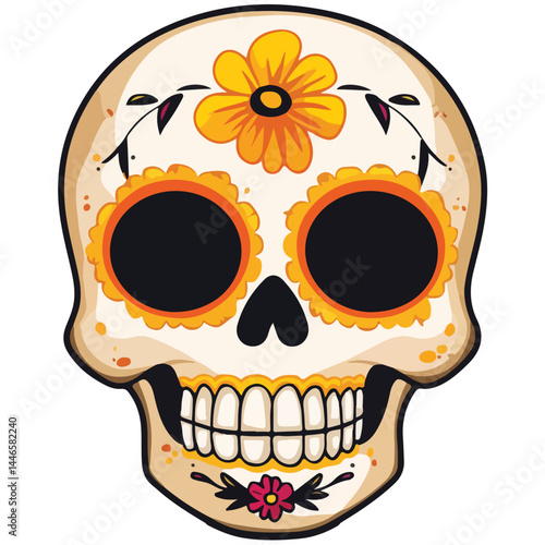 Detailed illustration of a human skull with a vintage aesthetic on an orange background