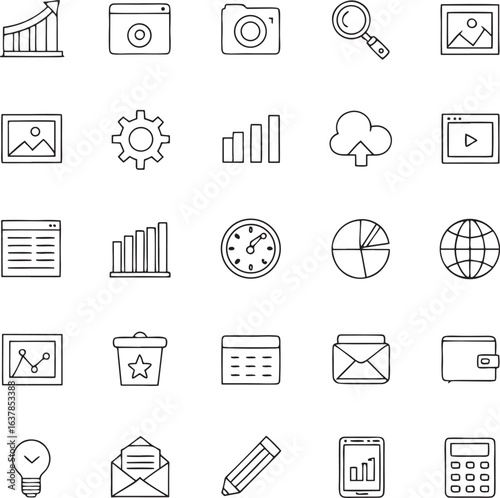 Video hosting set icon. Image sharing, video streaming, video player, 3D modeling, cloud service, playback, mobile app, playlist, digital note, voice assistant, puzzle, interface.