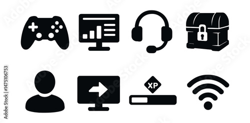 Tech and gaming solid icons set – modern, filled, digital and multimedia symbols