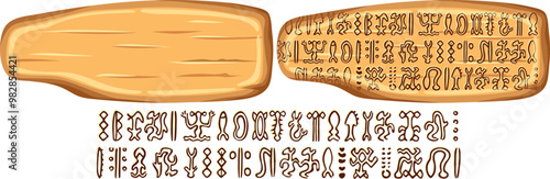 Undeciphered gryph Rongorongo on Easter island  or Rapa Nui. Isolated vector cartoon wooden panel. Undeciphered captions ancient peoples. Signboard with old texts. Gui elements for computer and board