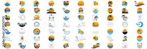 Summer beach island with palm trees in the ocean. Vector emblem of travel, holiday, resort. Vector Logo collection.