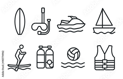 Water, sport, icons, vector, illustration, sketch, outline, swimming, sailing, kayaking, diving, jet, ski, paddleboarding, activity, ocean, wave, recreation, adventure, exercise