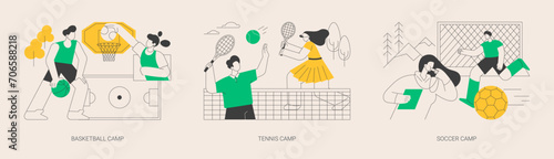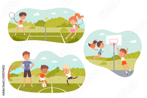 Summer sport camp for children set, boys and girls play tennis, soccer and basketball