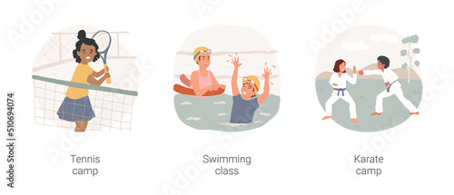 Gradeschoolers motor development isolated cartoon vector illustration set. Tennis camp, swimming class, karate PA day program, afterschool training, physical exercise, kids activity vector cartoon.