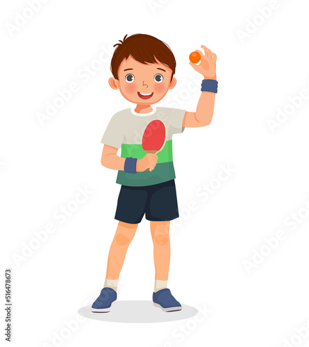Cute little boy table tennis player holding ping pong ball with paddle ready to play