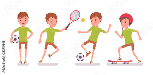 Boy child 7-9 years old, male school age kid sport activity. Happy strong schoolboy playing football, tennis game, skateboarding. Vector flat style cartoon illustration isolated on white background