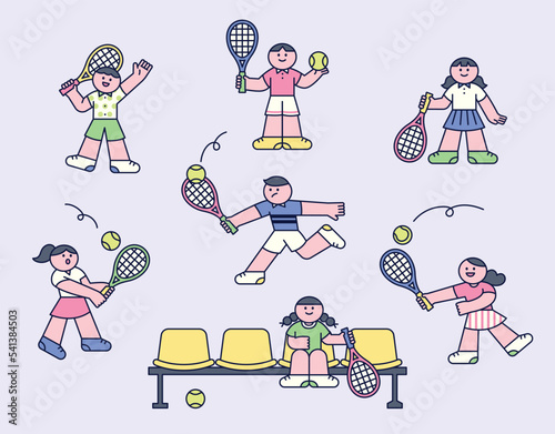 Cute characters in tennis uniforms are playing tennis. flat vector illustration.