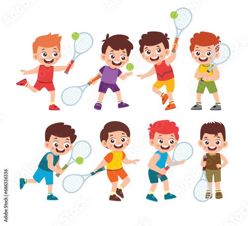 Set of Cute Little Boy Playing Tennis Kid Children with Various Different Poses. Activity Isolated Element Objects. Flat Style Icon Vector Illustration
