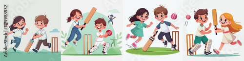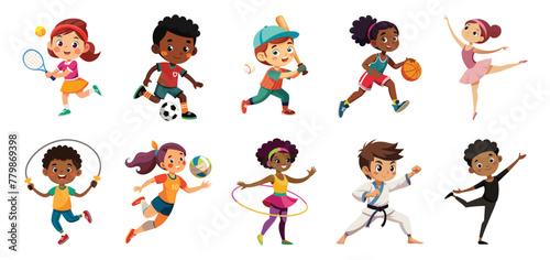 Kids in Sports Activities, vibrant vector cartoon illustration. Young Athletes playing Tennis, Soccer, basketball, baseball, and practicing Ballet.