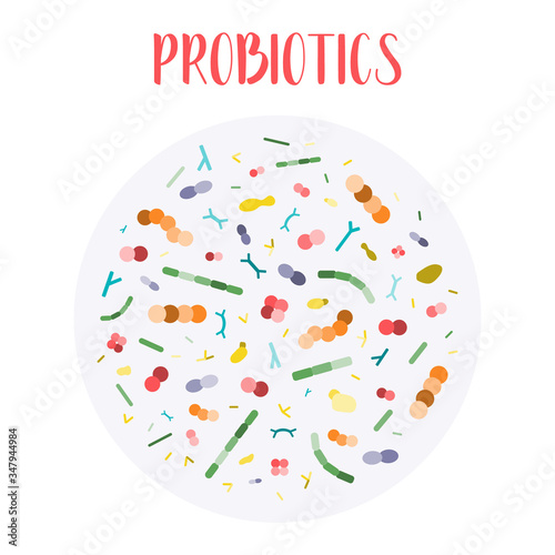 Vector probiotics in circular shape. Bifidobacterium, lactobacillus, streptococcus thermophilus, lactococcus, propionibacterium. Brochure, label, cover, poster, package, advertising, presentation