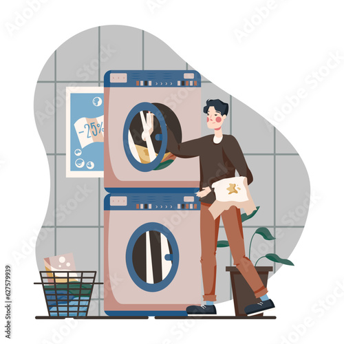 Laundry washer and dry machine cleaning service flat vector graphic or launderette washroom cleaning laundromat for household appliance illustration, dirty and clean towel duvet clothes laundromat