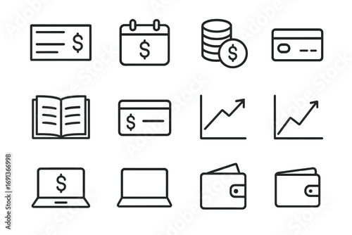 Financial planning icons showing budgeting, investment, and transaction processes in a simple line art style