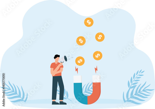 Affiliate Marketing Concept. Character sitting with laptop and making money.