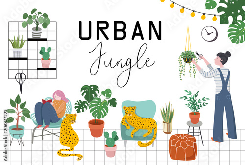 Urban jungle, trendy home decor with plants, leopards, cacti, tropical leaves