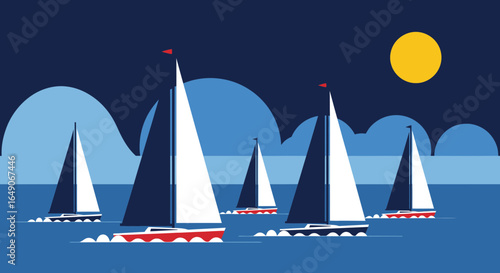 Graphic Sailing Regatta Background With Sailboats Racing In The Sea Vector Illustration