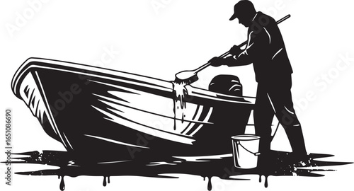 Elderly man painting wooden boat in isometric style