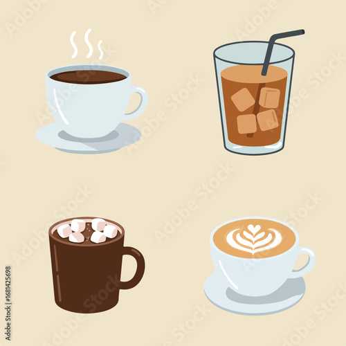 Diverse Coffee Collection Illustration Featuring Espresso Latte Cappuccino and Frappuccino Drinks for Cafe and Restaurant Menus