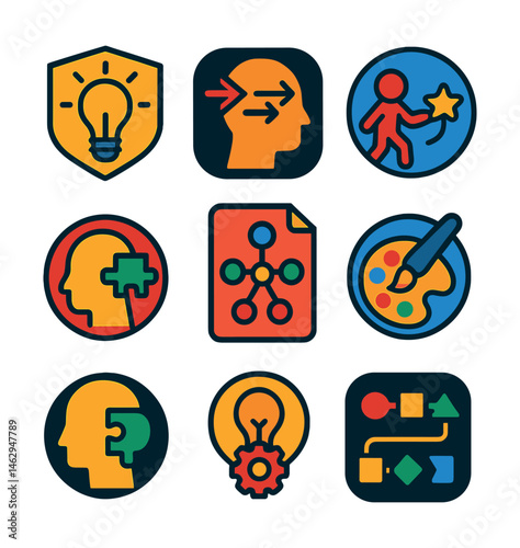 Flat creative brainstorming icon set featuring idea, innovation, discussion, mind‑map, solution, planning, sketch, and collaboration symbols. Ideal for workshops, presentations, and UI UX design.