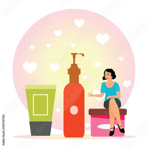Skin care scenes. Cute young woman applies cream and cleansing or moisturizing her skin. The concept of organic natural cosmetics. Flat style vector illustration.