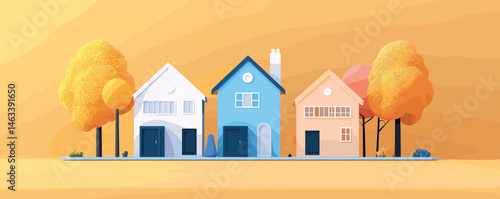 Row colorful suburban houses with various architectural styles and autumn trees in flat minimalist vector illustration for neighborhood concept