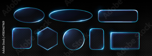 Glass frames with purple neon light set - rectangle and round, square and oval shapes with glowing effect. Futuristic glossy banner border design elements. Night club or game hud ui geometric signs.
