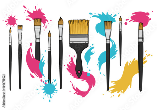 Outline vector set of painting brush icons, artist tool types with hog bristle, sable hair, synthetic and nylon filament, line art for art supplies, education, design, transparent background