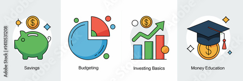 Flat vector icon set representing financial literacy with savings, budgeting, and investing concepts