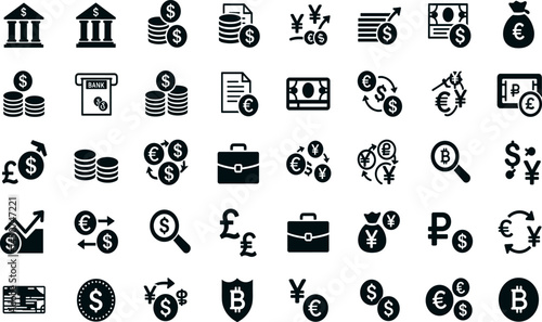 Currency exchange, financial growth icon set. Vector glyph pictograms of dollar, euro, yen, cryptocurrency, stock market, banking, investment, global economy black silhouette