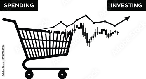 Illustration of a split circular diagram with investment and strategy icons, indicating a two step process. Useful for business presentations, investment strategies, and financial analysis visuals