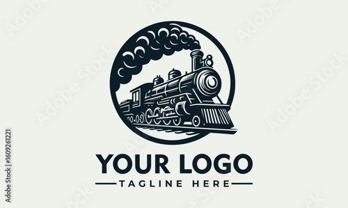 Vintage steam locomotive logo design with billowing smoke, a classic train emblem.
