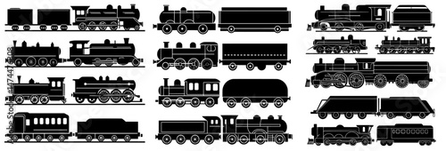 Vintage steam train silhouettes, historical locomotives, antique railway cars, retro transportation, black vector icons, classic travel, old-fashioned engines, heritage