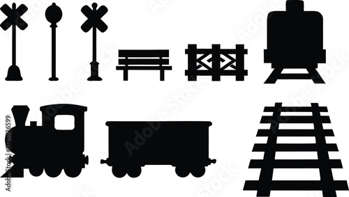 Collection of train related silhouette elements including railroad crossing signs bench fence water tower locomotive cargo car and track isolated on white background silhouette