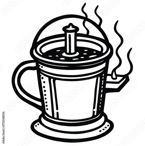 Enameled Coffee Percolator with Liquid Filling Illustration, Detailed Line Art Isolated on White, Classic Kitchenware Equipment