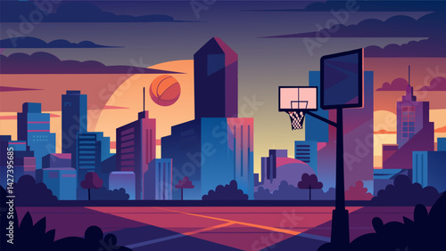 urban basketball court at sunset, 2D vector art