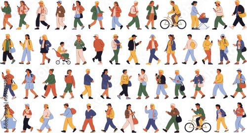 Diverse Group of People Walking and Using Smartphones in a City Street Setting Keywords: people, walking, city