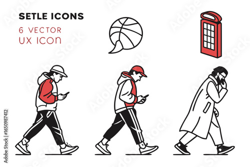 People walking with phones, basketball and phone booth icons isolated on white background