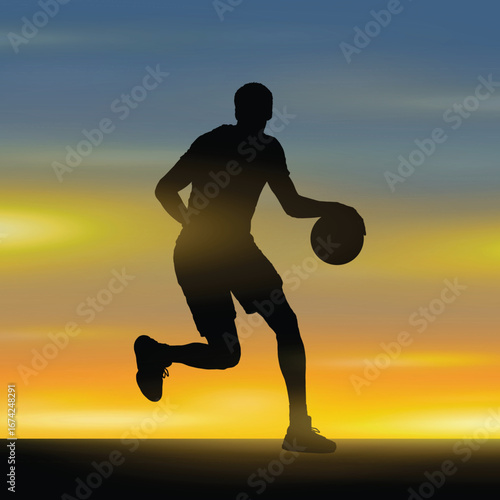 Dynamic silhouette of a young man dribbling a basketball with a stylized oversized basketball in the background showcasing urban street style and athletic movement